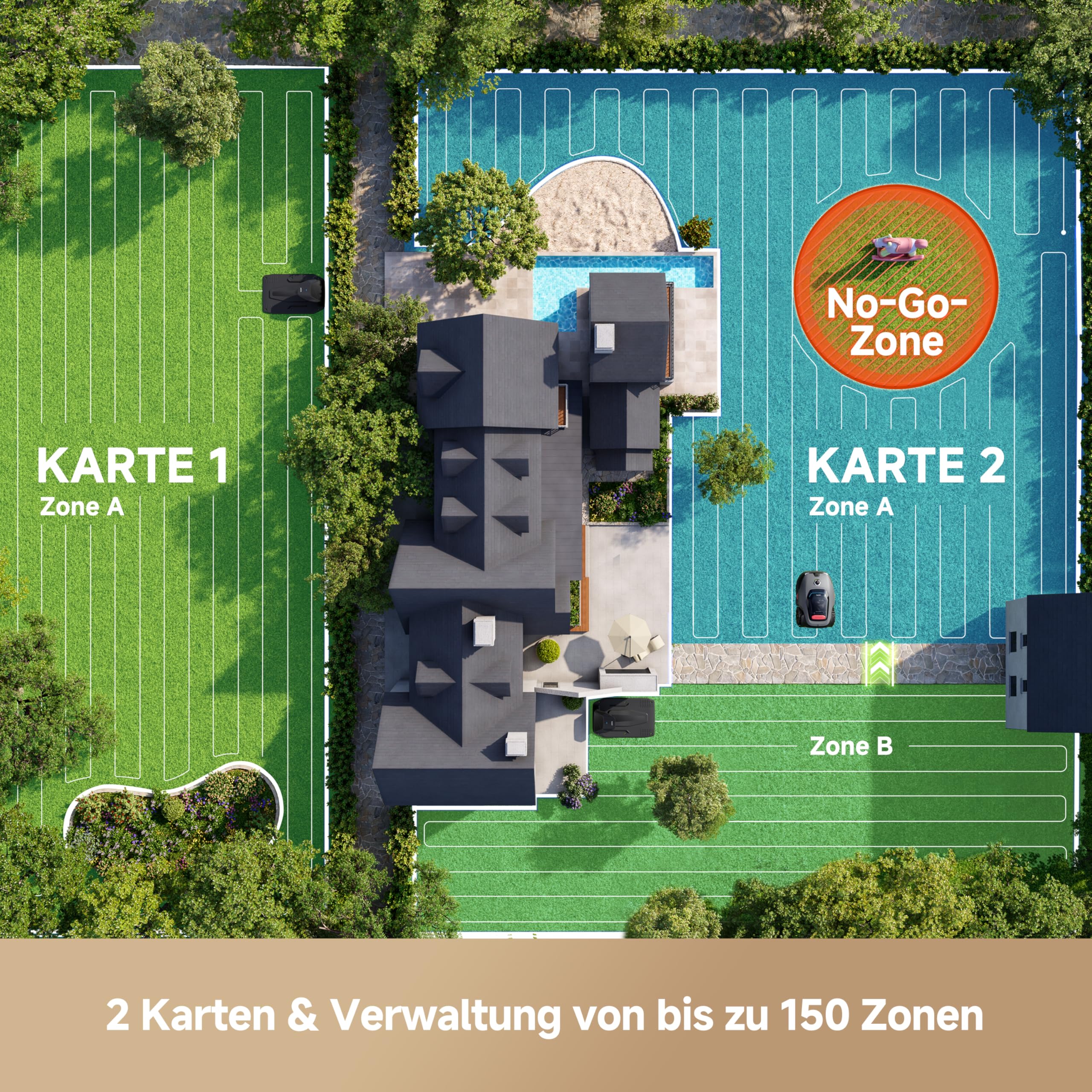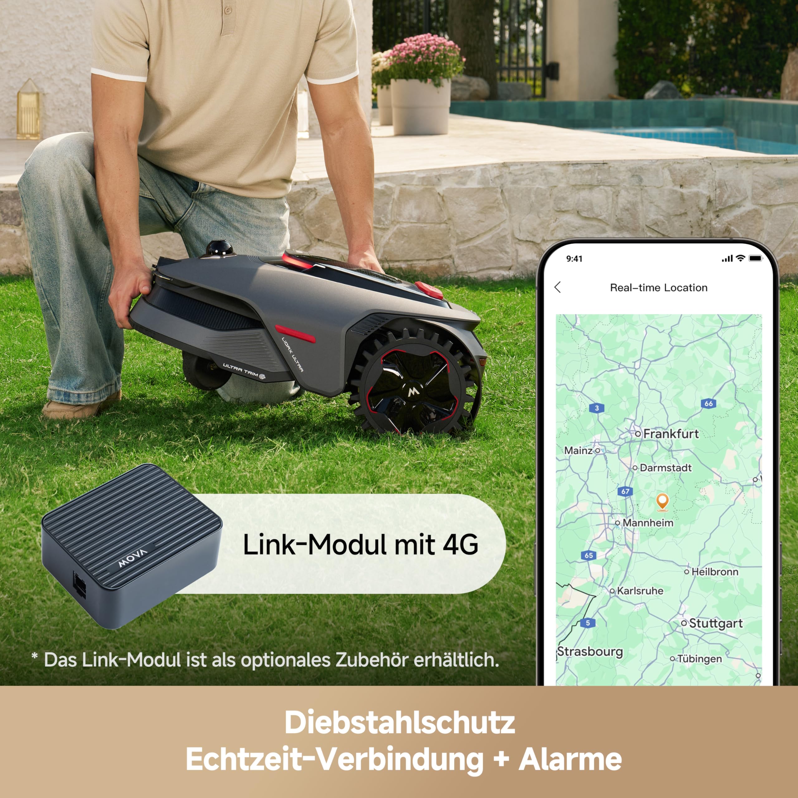 Das U-förmige Mähsystem sorgt für gleichmäßige Abdeckung. Über die MOVAhome App lassen sich bis zu zwei Karten, mehrere Zonen, Mähpläne und die Schnitthöhe von 3 bis 10 cm bequem verwalten.